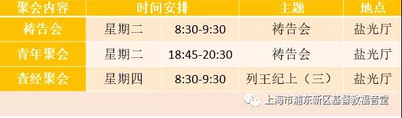 其中周二晚上在盐光厅举行的祷告会主题为“扩张疆界 全然更新 悔改-破碎旧造”,请各位同工祷告求主分别时间参与,非常欢迎会众一同参与。