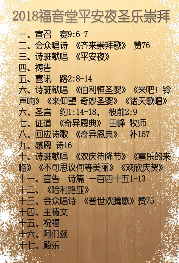 2、由于参加圣诞崇拜的人数较多,截至18:45分止不予为他人占用空位,请听从招待安排入座。