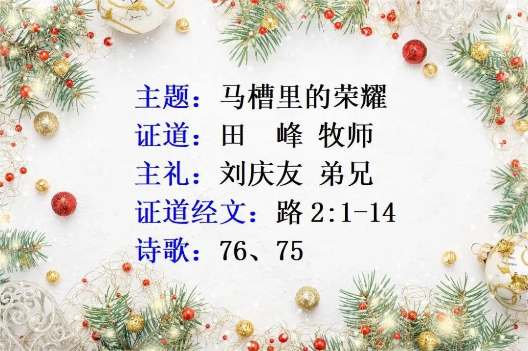 时间第一堂8:00-9:00 第二堂10:00-11:00 讲题以马内利 证道赵 静 牧师 主礼瞿明蔚 姊妹 证道经文太1:18-25 诗歌76、85